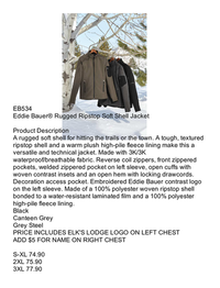 A rugged soft shell for hitting the trails or the town. A tough, textured ripstop shell and a warm plush high-pile fleece lining make this a versatile and technical jacket. Made with 3K/3K waterproof/breathable fabric. Reverse coil zippers, front zippered pockets, welded zippered pocket on left sleeve, open cuffs with woven contrast insets and an open hem with locking drawcords. Decoration access pocket. Embroidered Eddie Bauer contrast logo on the left sleeve. Made of a 100% polyester woven ripstop shell bonded to a water-resistant laminated film and a 100% polyester high-pile fleece lining.