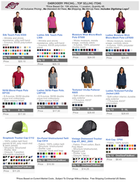 EMBROIDERY PRICING...TOP SELLING ITEMS